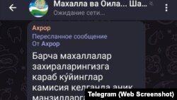 В распоряжении редакции «Озодлика» имеется скриншот переписки в мессенджере Telegram, в которой ответственным лицам махаллинских сходов граждан поручают проверять у жителей района запасы овощей на зиму.