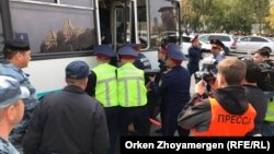 Человек, назвавшийся сотрудником акимата Нур-Султана, сказал собравшимся, что местные власти не давали разрешения на акцию, следовательно она является незаконной.
